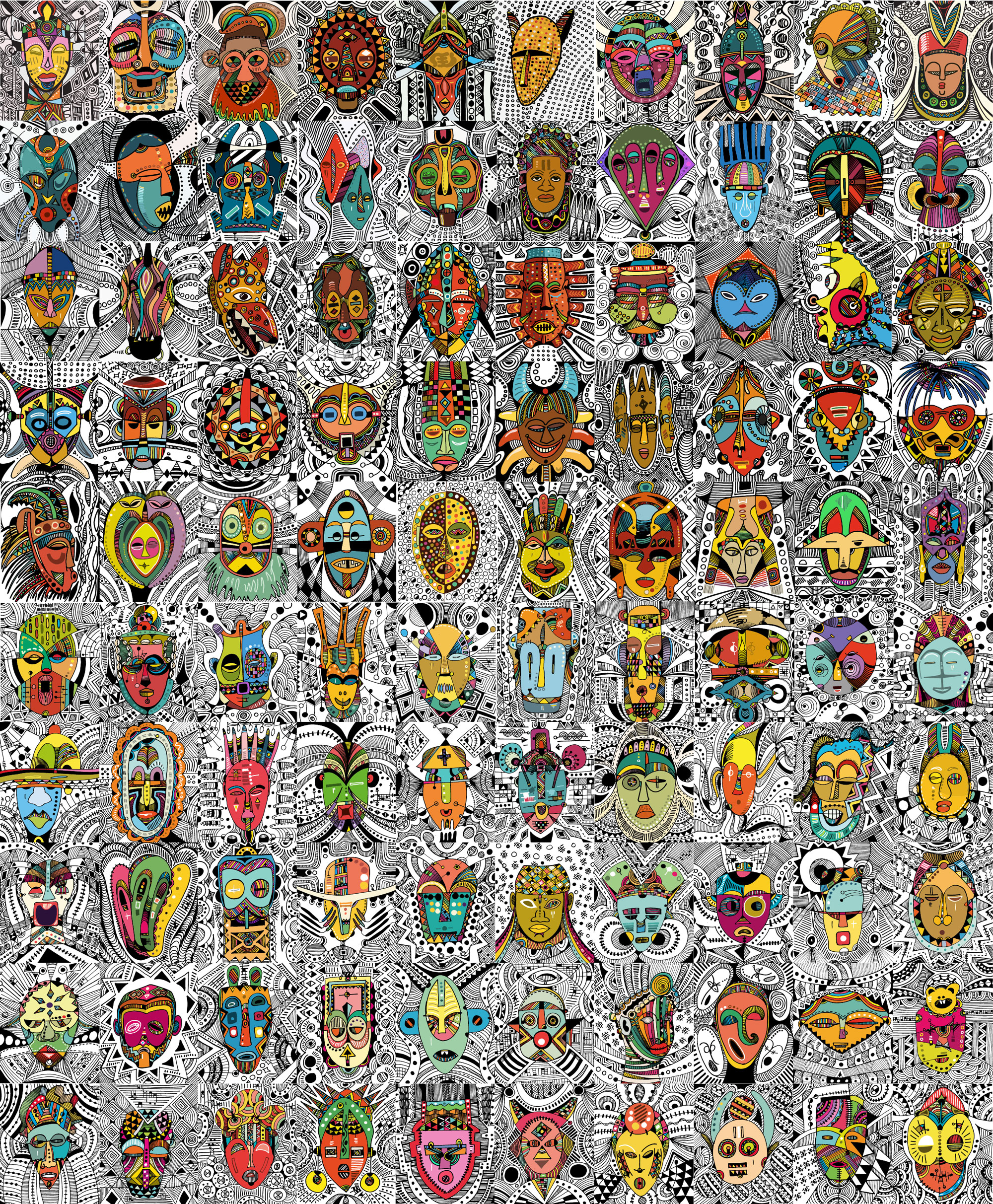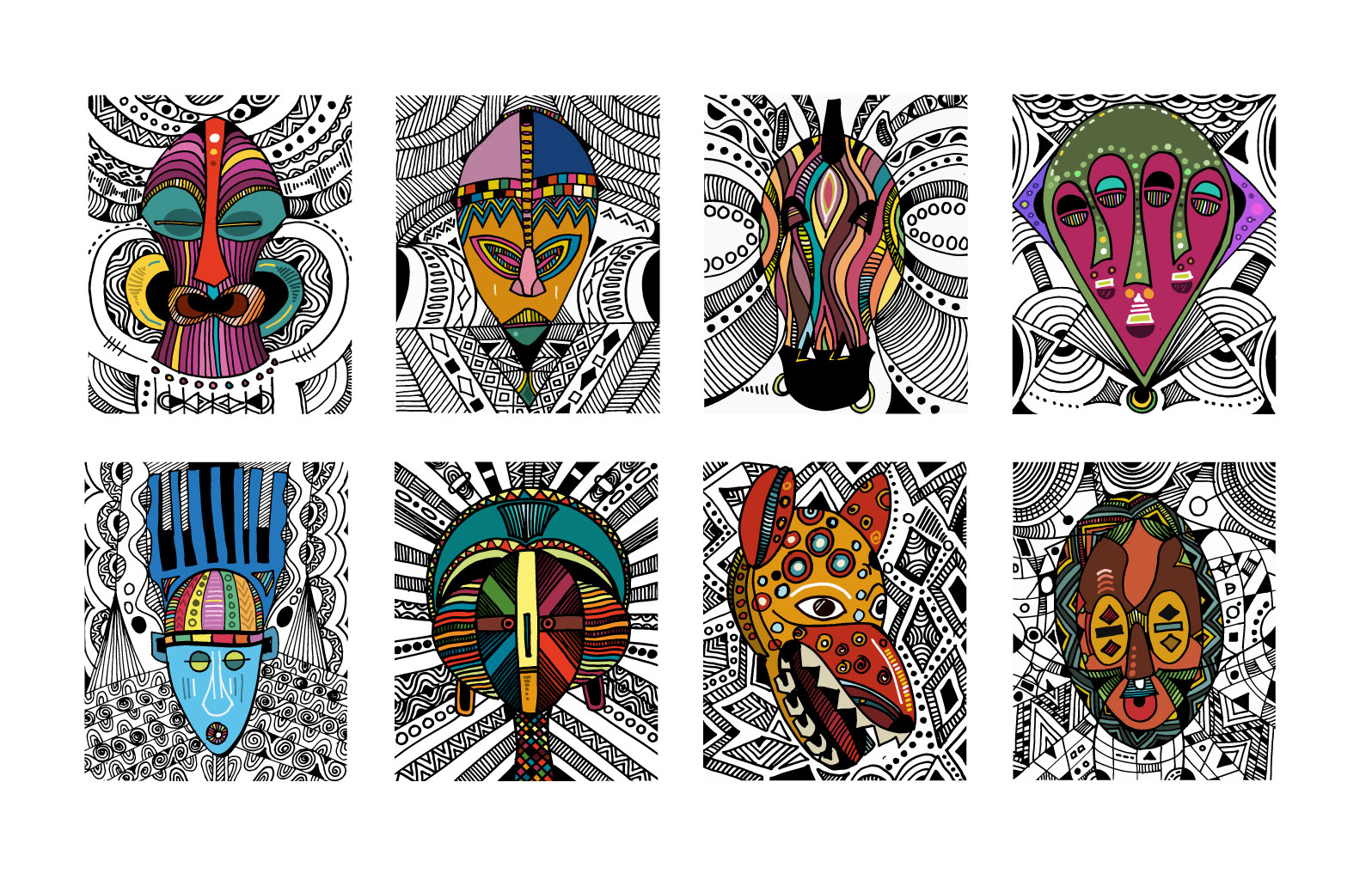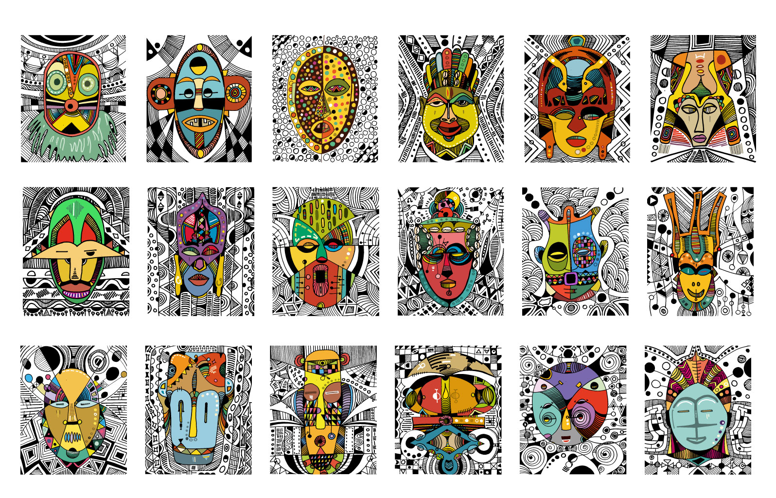 Masked, my outing body of work is a visual expression of lines and colours dipped from my moments of fear and despair, hopelessness and hope, fate and faith couched in revolving layers of subliminal performance. It is a renaissance of my art expression that has always been part of my composition and artistic mandate. It is the showing of a collaborative outcome created for experiential learning enabled and magnified by digital platforms for Africans and Diaspora Africa. Drawing from the mask-wearing culture of Africa, this collection was created by synthesizing free hand and digital tools, resulting in 100 expressions of illustrations reminiscent of the age long curvilinear Uli art form.